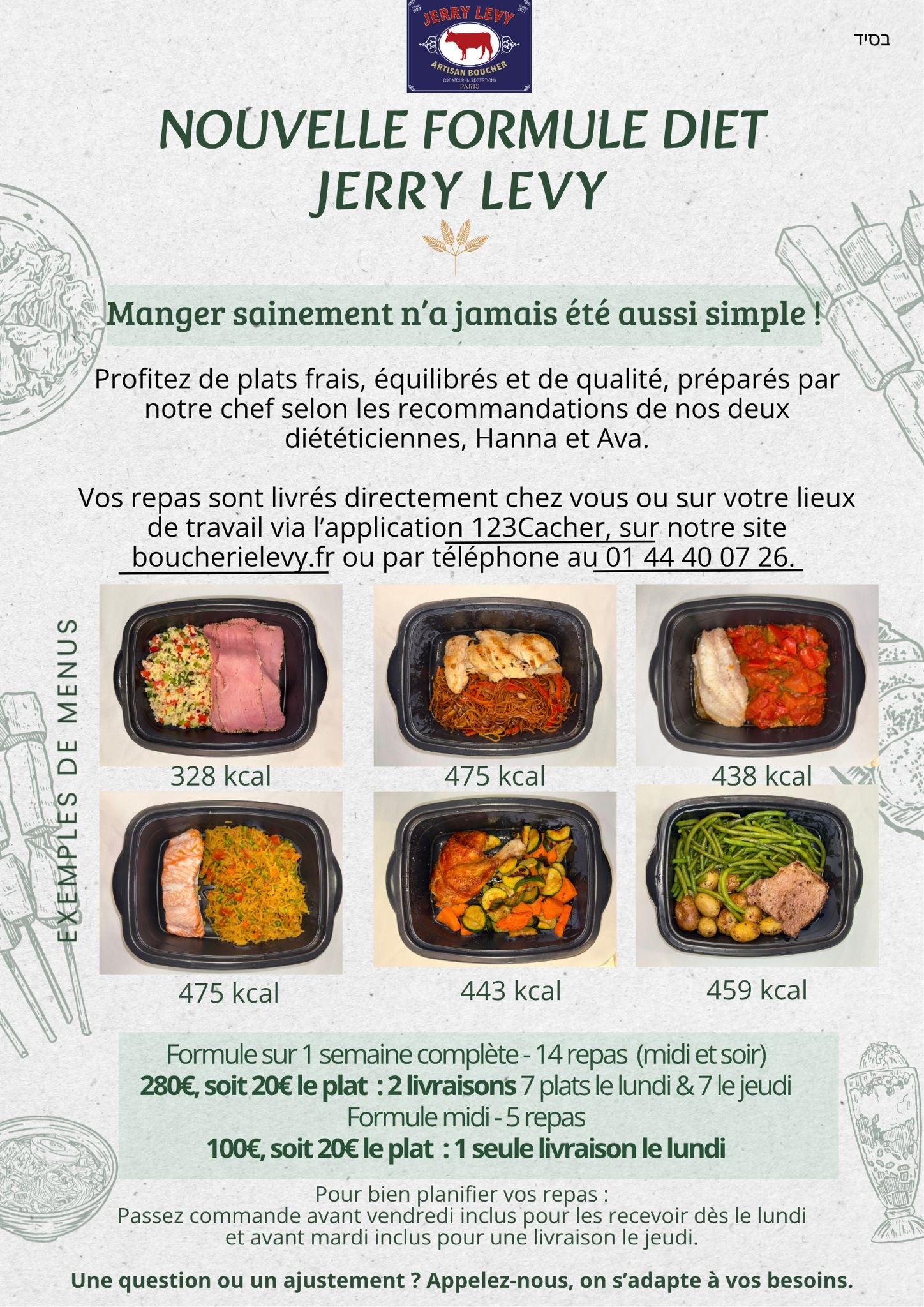 Vos repas sont livrés directement chez vous ou sur votre lieu de travail via l’application 123Cacher, sur notre site boucherielevy.fr ou par téléphone au 01 44 40 07 26.