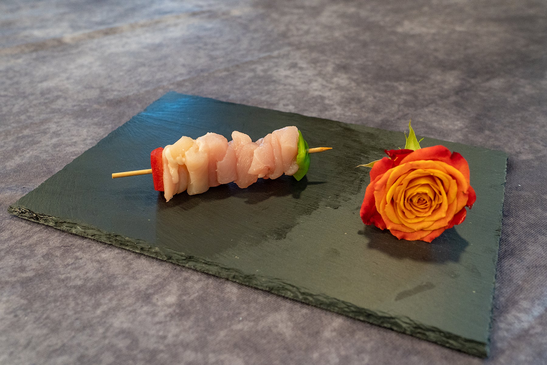 Morceaux de poulet découpés en cubes et prêts à être grillés au barbecue. Compter une brochette par personne.