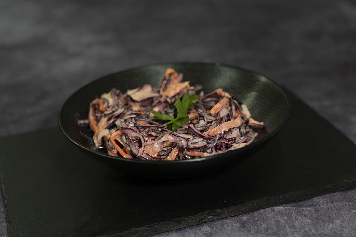 Salade de chou rouge fraîchement coupé et assaisonné, spécialement réalisé par Jerry pour Pessah.